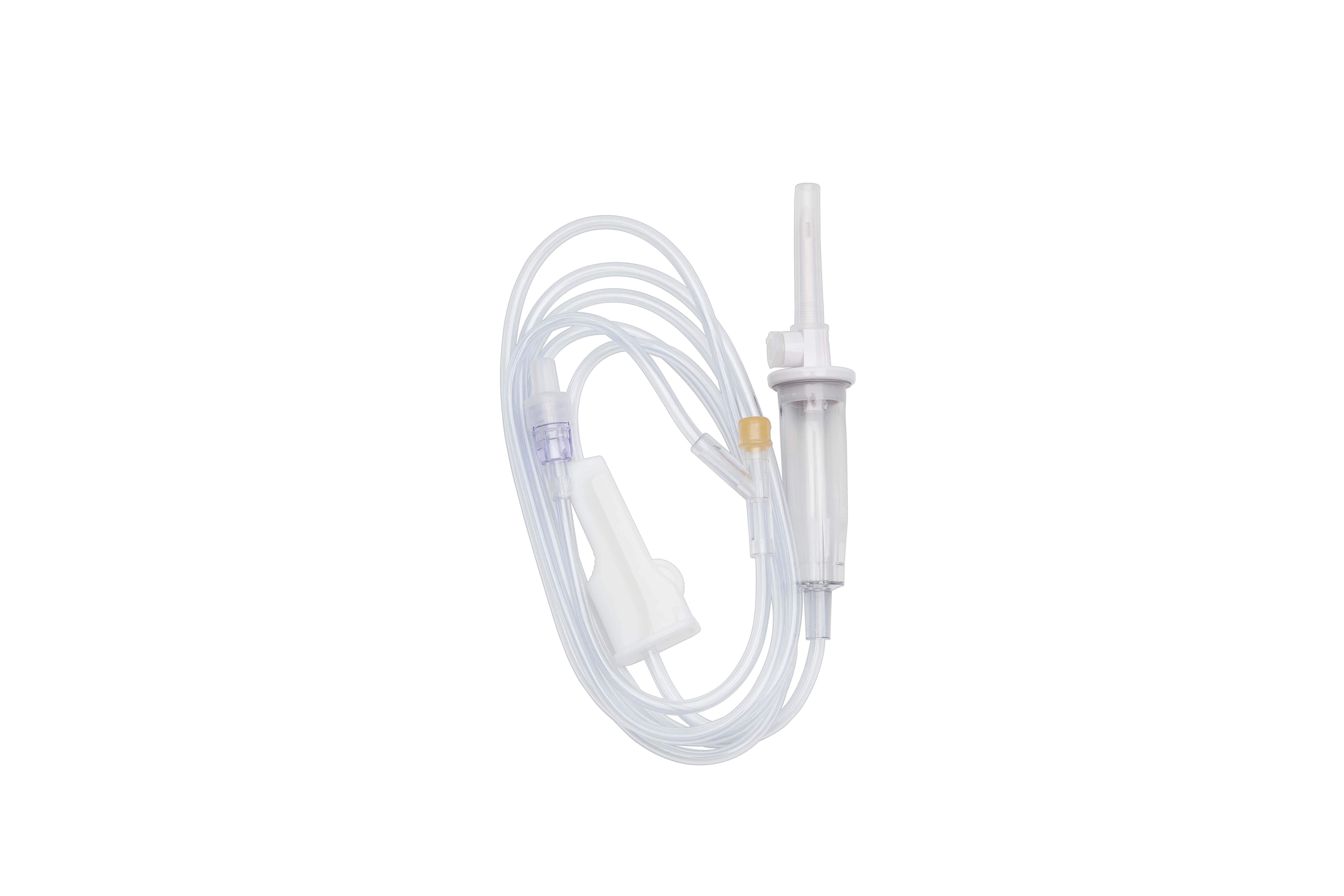 Universal spike (15 drops/mL), roller clamp, slide clamp, injection site 6 inches above distal end, SPIN-LOCK® connector. Priming volume: 15 mL, Length: 83 in. (211 cm). Not made with natural rubber latex or DEHP.